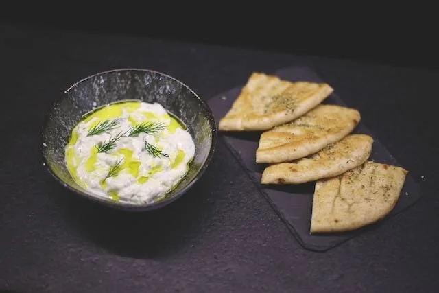 El tzatziki es una salsa de yogur, pepino, ajo (mucho!) y eneldo. Todo un vicio. Puedes probarla como aperitivo o como guarnición de varios platos principales. Untado en pan de pita recién horneado, es un verdadero placer.
