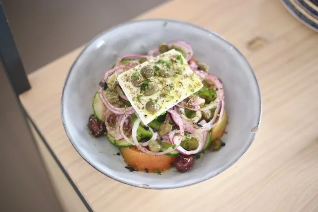 Esta es probablemente la ensalada griega más famosa y la que nunca falta en la mesa. Aunque se come en muchas partes del mundo, los sabores son más auténticos en Grecia: tomates y pimientos cultivados al sol, queso feta local, aceitunas negras, cebollas, pepinos frescos y jugosos y hierbas aromáticas tradicionales. Si no queda nada en el plato, puedes rebañar el aliño con pan. En Grecia se llama “papara”.